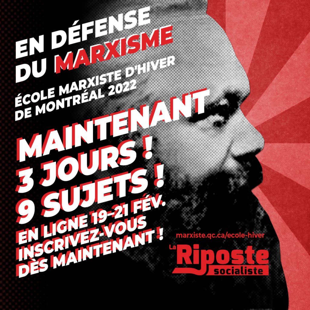 Signe de la popularité croissante des idées révolutionnaires, l’École marxiste d’hiver de Montréal n’a cessé de grandir au fil des ans, pour devenir le plus grand rassemblement marxiste au Québec et au Canada. La 12e édition de l’École marxiste aura lieu sur Zoom les 19, 20 et 21 février 2022.