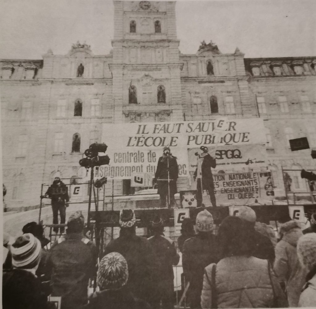 René Lévesque et le PQ, quant à eux, voulaient mettre l’enjeu de la souveraineté du Québec à l’avant-plan en reléguant tout le reste à un futur indéterminé. Le PQ a été l’outil idéal pour éteindre l’élan révolutionnaire du mouvement ouvrier au nom du projet de souveraineté. Malheureusement, la plupart des dirigeants syndicaux de l’époque appuient le PQ et lui permettent de coopter le mouvement syndical. Parmi les cas notables se trouvent l’ex-dirigeant du FLQ Pierre Vallières et le RIN, qui s’est dissout pour rejoindre le PQ. Après la défaite de la grève générale de 1972, la plupart des directions syndicales ont poussé pour appuyer le PQ. Nous payons encore pour ces erreurs aujourd’hui.