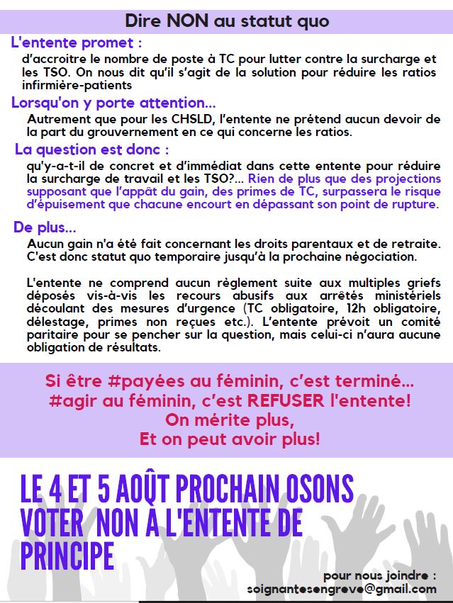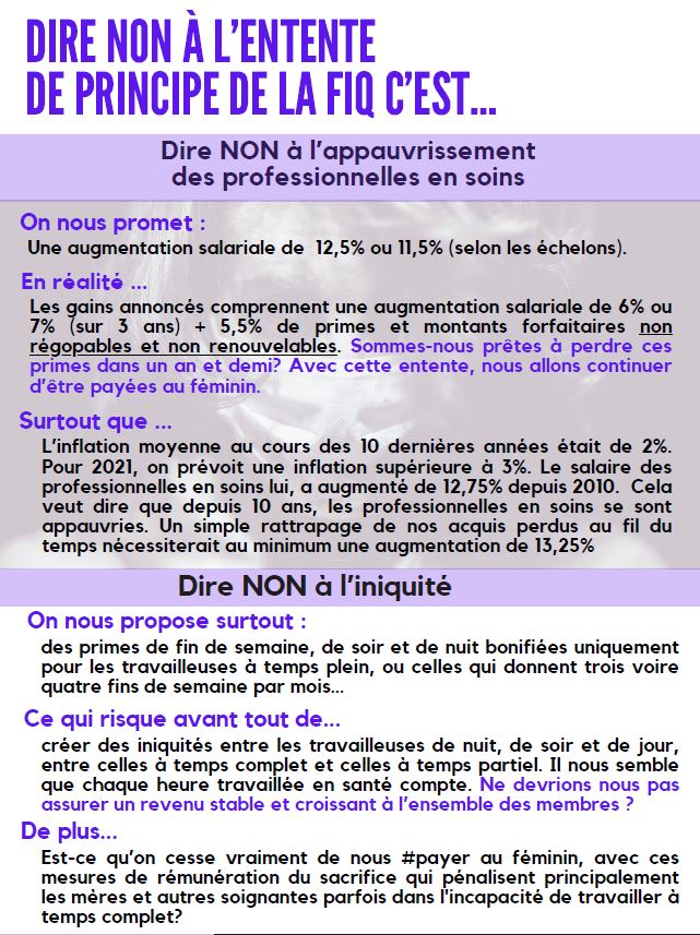 Le comité de mobilisation FIQ en grève a publié un tract avec les raisons principales pour lesquelles l’entente doit être rejetée.