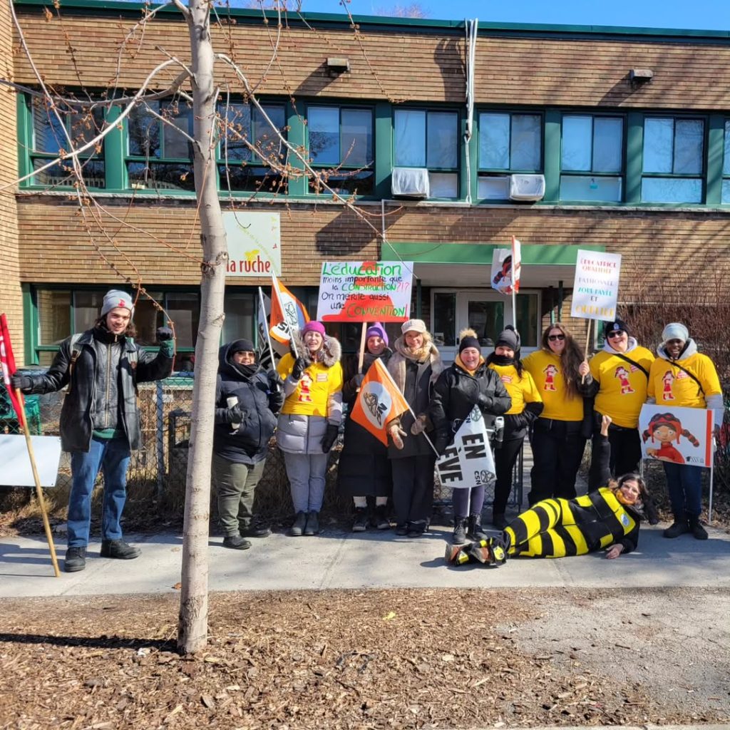 A : Mais pour se faire entendre, on n’a malheureusement pas le choix de se rendre là. Au moins on a vraiment le soutien des parents, qui savent qu’on préférerait mille fois être dans nos locaux avec eux. Mais la réalité du gouvernement fait qu’on n’a pas le choix de se rendre là.