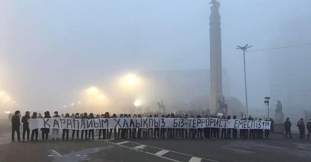 « Dans le même temps, des rassemblements permanents avaient commencé dès le mardi à Atyraou, Uraksj, Aktioubé, Kyzyl-Orda, Taraz, Taldykorgan, Turkestan, Shymkent, Ekibastuz, dans les villes de la région d’Almaty et à Almaty elle-même. Dans cette dernière ville, l’interdiction des rassemblements a débouché sur des affrontements avec la police dès la nuit du 4 au 5 janvier, et sur l’occupation provisoire des bâtiments de l’administration régionale. Cela a servi d’excuse à Kassym-Jomart Tokaïev pour proclamer l’état d’urgence.