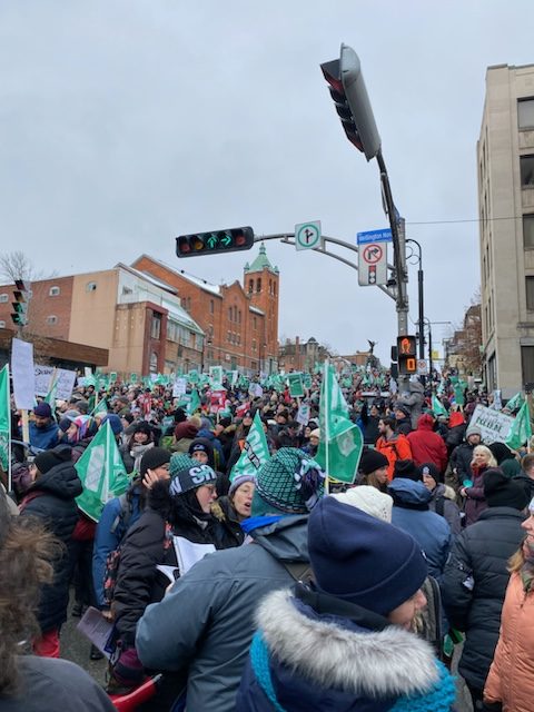 Ce débrayage massif s’est déroulé dans le cadre des négociations pour le renouvellement des conventions collectives, entamées au printemps dernier. Bien que tous les syndicats aient un mandat de grève illimitée voté à plus de 90% partout, seule la FAE, qui représente 66000 enseignantes, l’utilise depuis le 23 novembre. Les autres, soit la FIQ (les infirmières), et le Front commun qui rassemble 425 000 travailleurs du secteur public de quatre centrales syndicales (CSN, FTQ, CSQ et APTS), ont organisé des journées de grève séparées ici et là depuis novembre.