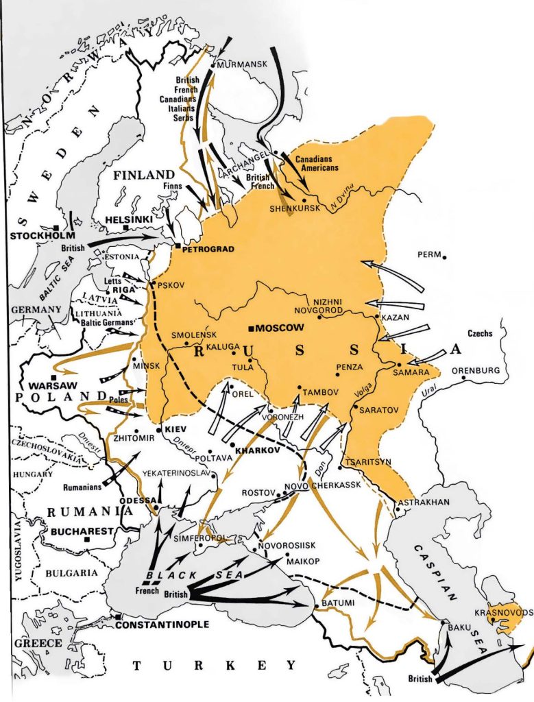 A cette aide matérielle s’ajoute l’envoi de troupes impérialistes qui participent directement à la guerre civile. Dès le début de l’année 1918, alors que les Allemands envahissent l’Ukraine, la Finlande et les Pays baltes, des contingents britanniques, américains et français occupent Bakou dans le Caucase, ainsi qu’Arkhangelsk et Mourmansk en Russie du Nord. Plus tard, les Français prennent la relève des Allemands sur les côtes d’Ukraine et de Crimée, tandis que les Japonais et les Américains débarquent à Vladivostok et occupent l’Extrême-Orient sibérien. Au total, les impérialistes d’Occident et du Japon envoient plus de 200 000 soldats combattre la Révolution russe.