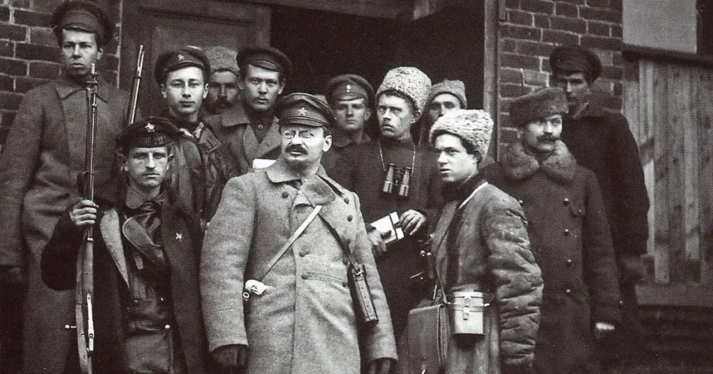 En janvier 1918, le régime soviétique créée l’« Armée Rouge des Ouvriers et des Paysans ». Il s’agit de constituer une force armée cohérente et centralisée sur la base du regroupement des détachements de Gardes rouges, de communistes volontaires et d’une masse de paysans mobilisés. Cette nouvelle armée manque de tout : elle n’a pas assez de fusils, d’uniformes et de munitions. Au printemps 1918, Léon Trotsky est nommé Commissaire du peuple à la guerre. Il reçoit la lourde charge de construire une armée capable de défendre la Russie soviétique.