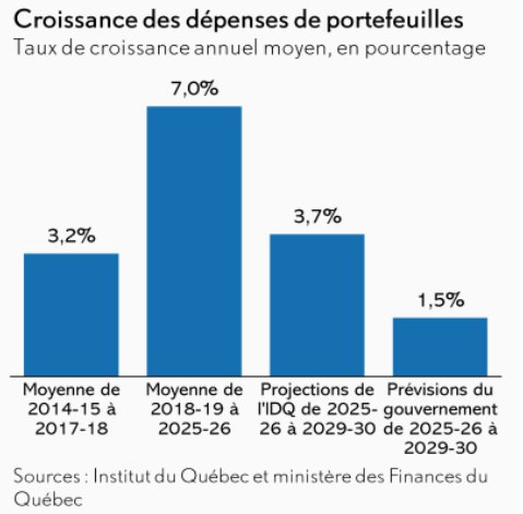 Selon l’IDQ, si un prochain gouvernement repousse le retour à l’équilibre budgétaire, le service de la dette passerait de 10,2 à 13,2 milliards de dollars entre 2025-2026 et 2029-2030, « détournant des ressources croissantes des services essentiels de l’État ».