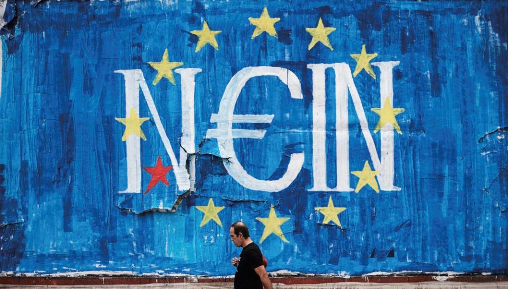 Les Grecs furent menacés : s’ils rejetaient le mémorandum, ils seraient expulsés de la zone euro et seraient condamnés à vivre dans une république bananière ruinée. Pour sa part, la BCE serra la vis aux banques grecques en limitant leurs liquidités. En réponse, le gouvernement fut contraint d’instaurer un contrôle des capitaux, y compris les retraits d’espèces aux distributeurs automatiques, pour éviter une avalanche de retraits bancaires.