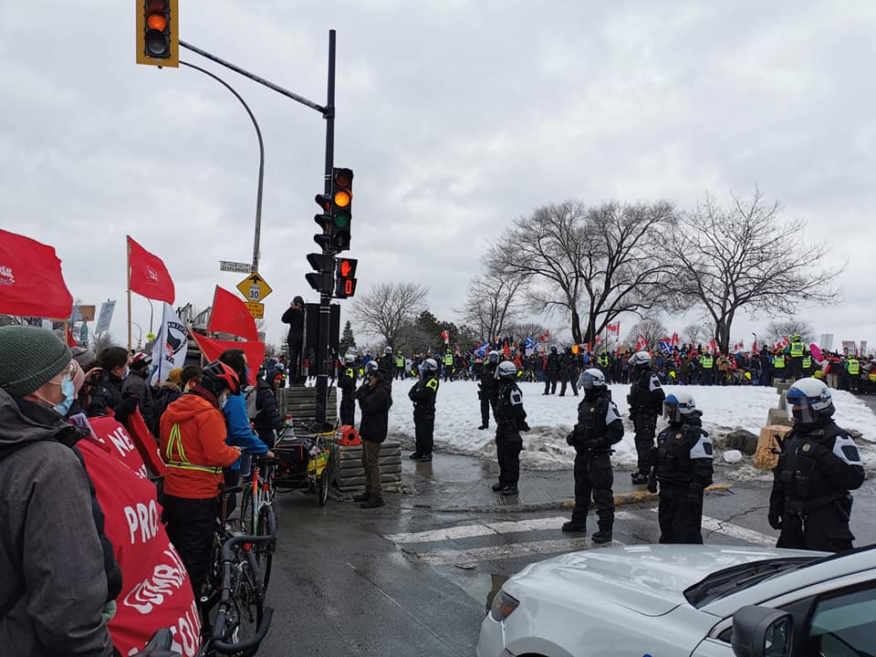 Une fois rassemblés, nous nous sommes dirigés vers la sortie du stationnement du Parc Jarry pour aller bloquer les voitures et les camions participant à la manifestation en appui au convoi. À ce moment-là, la police s’est positionnée entre la manifestation et sa contre-manifestation. À travers une marée de drapeaux canadiens et québécois, et même des drapeaux des Patriotes, nous avons aperçu des drapeaux de Donald Trump, des drapeaux et des gilets du Parti Populaire du Canada, et des photos de son chef Maxime Bernier. Plusieurs de nos militants se sont fait crier d’enlever leurs masques par les manifestants. Nous savons qu’ailleurs dans le pays les manifestants du convoi ont harcelé des travailleuses de la santé et ont violenté des passants, y compris des sans-abris.
