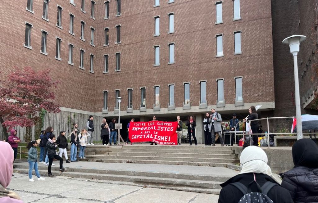 À l’Université de Montréal, le groupe Solidarité pour les droits humains du peuple palestinien UdeM, avec l’aide des membres de La Riposte socialiste, a organisé un débrayage d’une centaine d’étudiants. Ils ont été rejoints par un contingent de l’UQAM (où il n’y avait pas de cours cette semaine là).