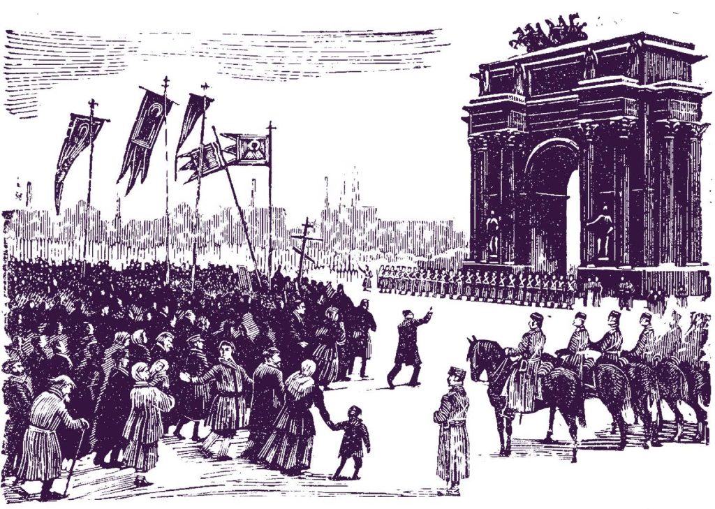 Le matin du 9 janvier (aux portes de Narva) (avant 1925), gravure d’un artiste inconnu.