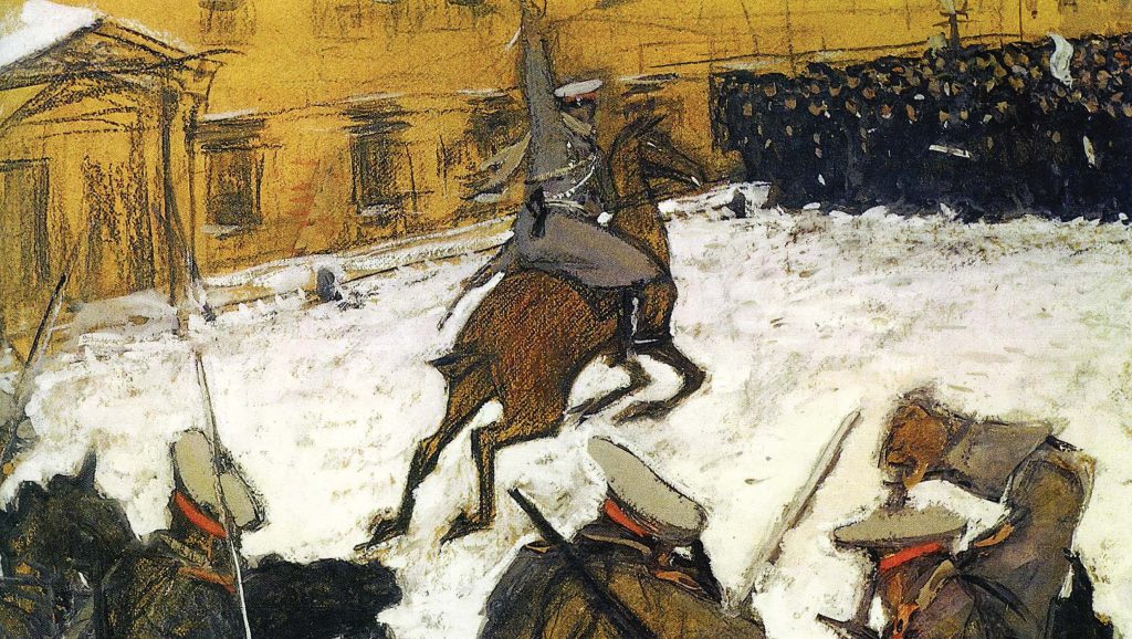 « Soldats, héros, où est passée votre gloire? » (1905), Valentin Serov, dépeignant soit les événements du Dimanche sanglant, soit la dispersion d’une manifestation à Moscou en octobre 1905.