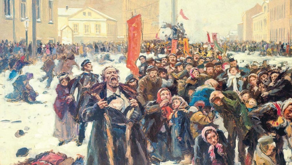Le 9 janvier (toutes les dates sont de l’ancien calendrier russe), devant le Palais d’Hiver, les cosaques ouvrirent le feu sur une manifestation pacifique d’ouvriers et de paysans qui voulaient remettre une pétition au tsar. Des centaines de personnes furent lâchement tuées. Connue sous le nom de « Dimanche sanglant », cette répression brutale provoqua une immense vague de grèves dans 122 villes et villages. Les étudiants se soulevèrent également, et les grandes universités de Saint-Pétersbourg et Kiev devinrent rapidement des lieux propices à l’activité révolutionnaire.