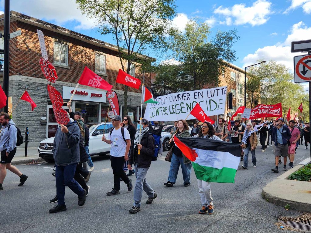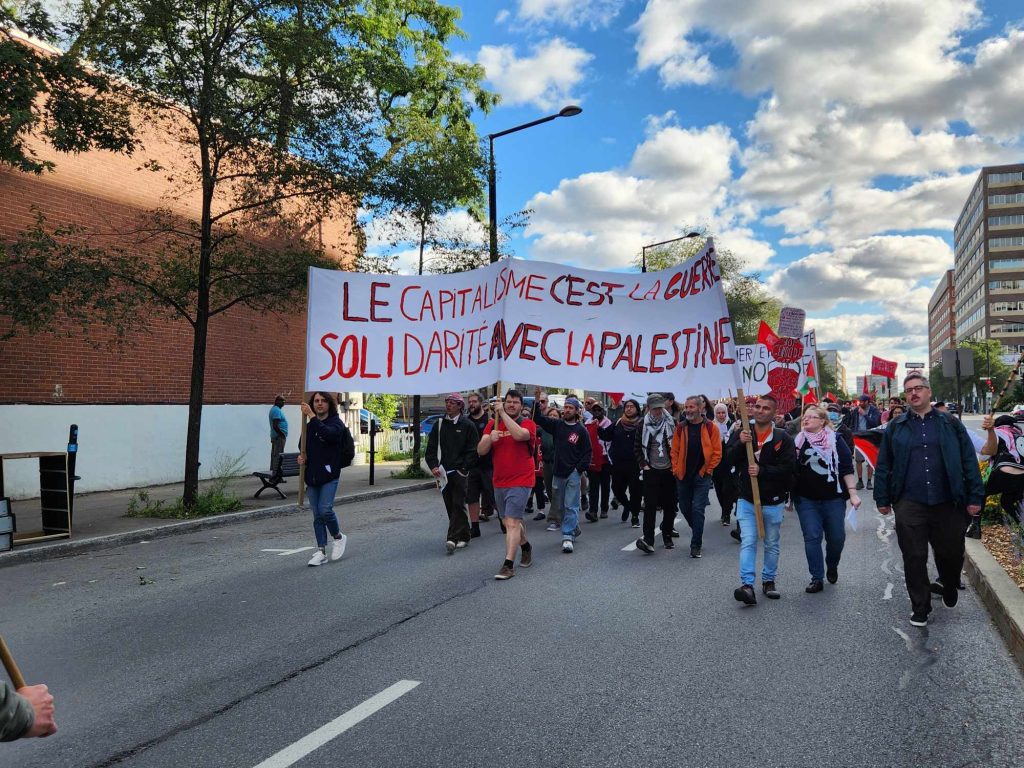 Plus de 120 personnes ont marché à Montréal ce lundi pour la 5e édition de la manifestation anticapitaliste de la fête du Travail. Sur le thème « Le capitalisme c’est la guerre! Solidarité avec la Palestine », les militants se sont rassemblés devant le bureau de Mélanie Joly, la ministre des Affaires étrangères, pour dénoncer la complicité de son gouvernement dans le génocide des Palestiniens.